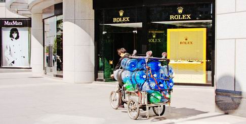 Toen ik vorig jaar aan mijn nieuwe baan begon, fietste ik vanuit mijn hutong twee ringwegen over naar het CBD: het Central Business District. Daar staan de luxe hotels, houden joint ventures kantoor, zijn er mooie warenhuizen, dure bars en restaurants. Ik ging daar alleen nooit heen omdat ik – voordat ik die baan vond – geen vast inkomen had en liever voor 16 Yuán (2 Euro) een shíguōbànfàn at (Koreaans gerecht; een hete stenen pot met daarin rijst, groenten en ei), dan dat ik 80 Yuán (10 Euro) of meer uitgaf aan een pizza. Voor mijn werk kom ik nu veel in de luxe hotels in het CBD, bezoek ik ambassades en dergelijke. De eerste keer dat ik vanuit de hutong naar het Kempinski ging, moet ik er als een verbaasd kind dat iets voor het eerst meemaakt hebben rondgelopen. De mooie kroonluchters aan het plafond en perfect gepolijste liftbedienden in zijden kostuums stonden in sterk contrast met mijn ietwat seniele buurman in zijn gewatteerde jas, die lege plastic flesjes verzamelt omdat je per flesje 1 Máo (1 Eurocent) statiegeld krijgt. De vloer was er zo schoon en glad dat ik er echt op heb moeten leren lopen zonder uit te glijden.