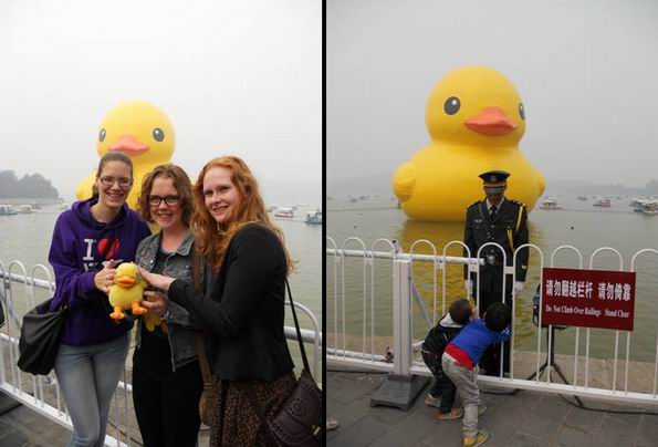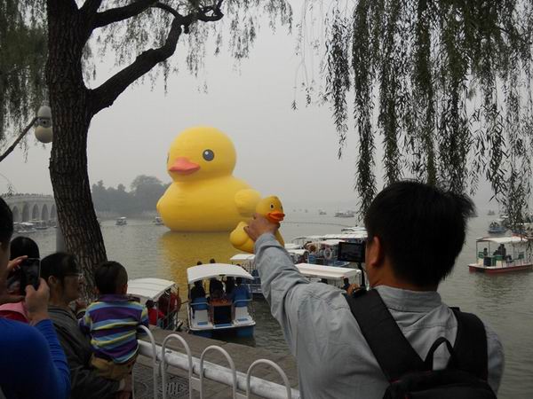 Jammer is dat Rubber Duck door de smog minder goed tot zijn recht komt in de toch zeer Chinese omgeving. De lucht is zo grauw dat je de kenmerkende Chinese gebouwen aan de overkant van het meer amper kunt zien. Chinezen hadden massaal gele eenden van thuis meegenomen om samen met Rubber Duck op de foto te zetten. Het is natuurlijk maar net wat je leuk vindt.