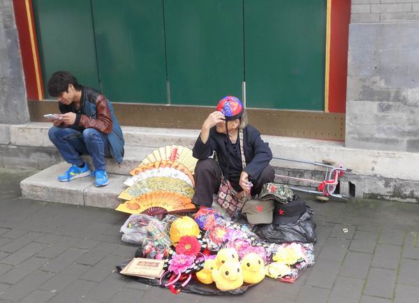 Voor 99 yuán (12 Euro) waren er officiële Rubber Ducks te koop. En hoewel dat voor een gemiddelde Chinees zeker niet goedkoop is, vlogen ze als warme broodjes over de toonbank. China zou China natuurlijk niet zijn als de zwarte markt in eenden niet welig zou tieren. Door het hele Zomerpaleis verspreid stonden vrouwen met pluche eenden, waarvan ze bij navraag een voorraadje in een tas verborgen bleken te hebben. Deze verkochten ze voor 30 yuán. Op de onderstaande foto zie je een verkoopster met iets meer lef, die haar waar openlijk uit durft te stallen: