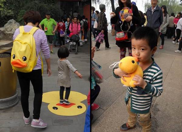 Gele rugzakken in de vorm van de eend zie je ineens overal in Beijing opduiken. En pluchen eenden zoals het jongetje op onderstaande foto heeft, worden niet alleen in het Zomerpaleis maar op alle straathoeken verkocht.