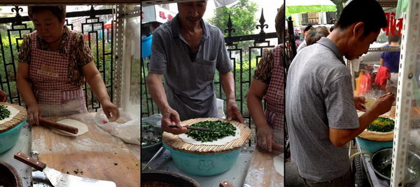Bij een kraampje als deze bestel je een hele (10 yuán) of een halve (5 yuán) portie. Veel van dit soort kraampjes worden door families gerund, zo ook hier. Een echtpaar werkt samen.