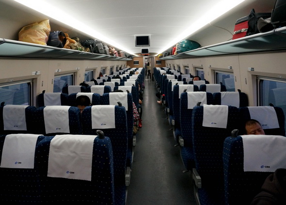 Wat bleek echter? Met Nieuwjaar mag Beijing dan wel leeglopen, er gaat werkelijk niemand naar de hoofdstad toe. Op ieder station tussen Wuhan en Beijing stapten er meer mensen uit, en halverwege zag de coupé er zo uit: