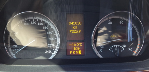 Dit is niet de temperatuur in de auto maar de buitentemperatuur. Al moet ik eerlijk zeggen dat ik zelf geen verschil voel tussen 37°C en 46°C, heet is heet.