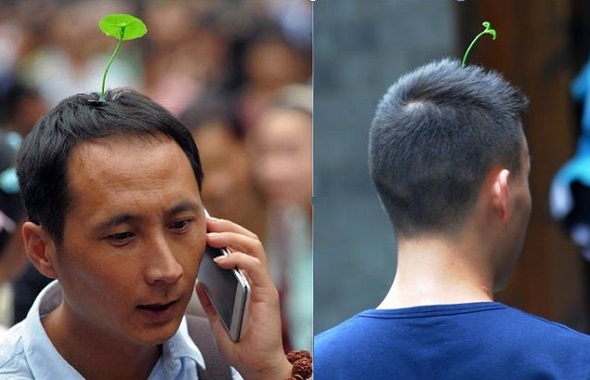 Je kunt het zo gek niet bedenken of in China kan het een trend worden. Twee weken geleden was ik in Beijing en liep vrijwel iedereen in en rondom de Nánluógǔxiàng ermee rond, inmiddels kun je er in het hele land niet meer omheen: een jonge kiem die uit de kruin van het hoofd lijkt te groeien: