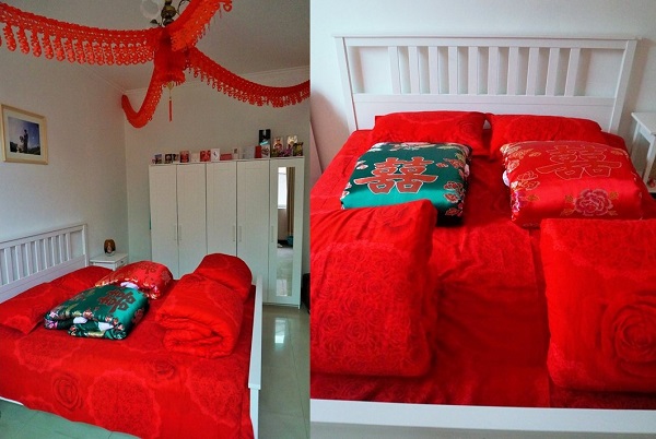 Onze kamer was speciaal voor de huwelijksdag versierd. Volgens de traditie hadden mooie huwelijksdekbedden laten maken, met het karakter voor ‘dubbel geluk’ (shuāngxǐ) erop: