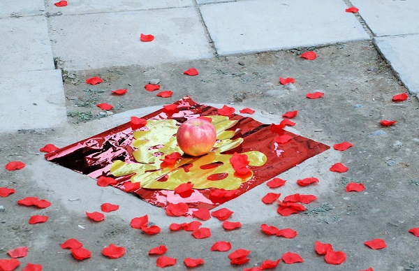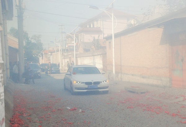 In de ochtend werd ik opgehaald door Zhang Yang en een stoet volgauto’s. Er werd er véél vuurwerk afgestoken toen we in Shahe aankwamen. Terwijl we van de auto naar de courtyard liepen, strooiden twee kinderen uit het dorp rozenblaadjes over ons heen. Daarbij liepen we langs een appel, gelegd op het karakter voor dubbel geluk. Appel is in het Chinees píngguǒ, wat in de verte een beetje als vrede (píng’ān) klinkt, dus symboliseert de appel vrede in onze toekomst.