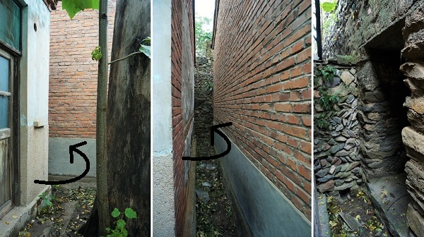 Tijdens de Sino-Japanse oorlog is Zhaojiatai verschillende keren aangevallen door de Japanners. De bewoners hebben daarom schuilkelders en tunnels gebouwd, die nog steeds toegankelijk zijn – mits je ze weet te vinden! Zie hier hoe je via zeer smalle steegjes en bochtjes bij een schuilkelder komt. Van links naar rechts zie je naast het huis een bijna onopmerkbaar gangetje, als je dat vervolgens doorloopt kun je nog een keer de bocht om en zie je de ingang van de schuilkelder.