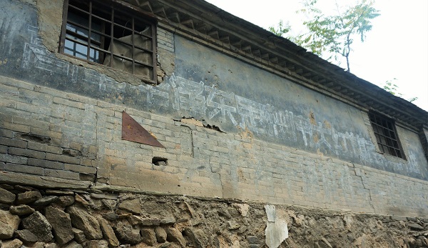 In oude dorpen kom je ook altijd Maoïstische leuzen uit de Culturele Revolutie tegen. Op deze muur staat: “Voorwaarts door het gedachtengoed van Mao Zedong!”.