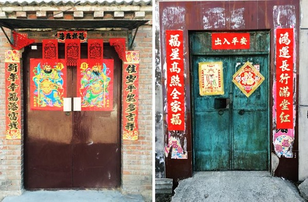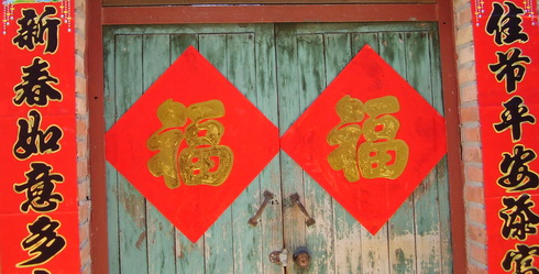10:30 uur: We gaan verder naar oudste tante, die een paar honderd meter verderop woont. Onderweg krijgen Zhang Yang en ik allebei een hóngbāo van tweede oom. Bij alle huizen waar we langs lopen zijn Nieuwjaarsspreuken op de deur geplakt om het jaar van de Aap te verwelkomen: