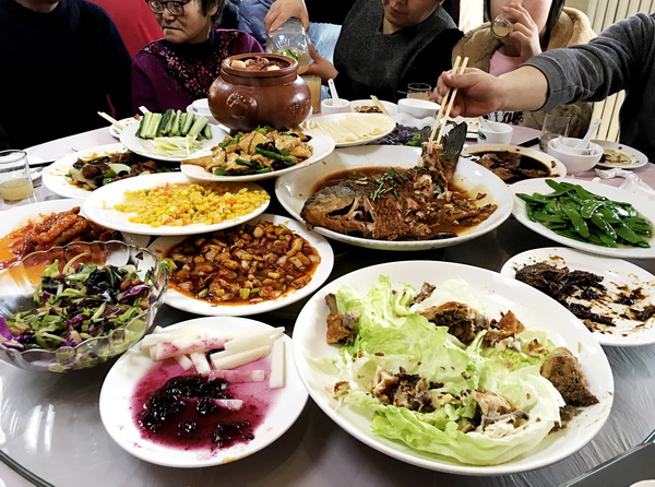 11:20 uur: Met de hele familie eten we een uitgebreide lunch. Oudste oom heeft een fles rode wijn meegenomen omdat hij verwacht dat een westerling als ik geen Chinese báijiǔ drinkt.