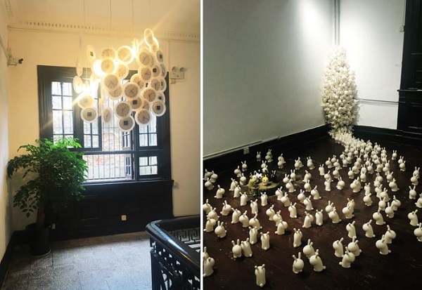 In verschillende kamers worden verschillende soorten kunst tentoongesteld, waaronder werk van opkomende Chinese schilders, schilderijen van architectuur in Wuhan en een aantal installaties, waaronder meer van de konijnen die we buiten al zagen.