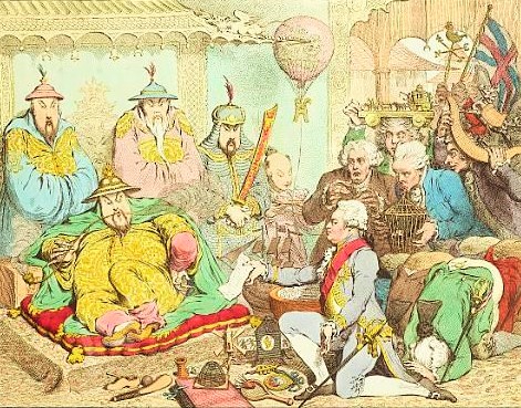 Het boek neemt ons vervolgens mee van China’s eerste contacten met het buitenland, langs belangrijke volksopstanden zoals de Taipingopstand en de Boxeropstand, naar de val van het Keizerrijk. De hoofdstukken zijn rijkelijk van afbeeldingen voorzien, waaronder onderstaande satirische tekening van Lord Macartney tijdens de eerste Britse diplomatieke missie naar China. Macartney weigerde de gebruikelijke kowtow voor keizer Qianlong te maken maar maakte tijdens zijn audiëntie een kniebuiging, zoals hij voor zijn eigen koning zou doen.