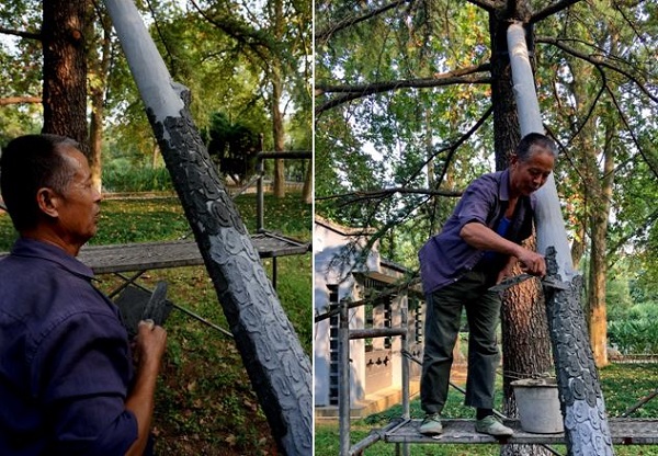 Een stukje verderop was meneer Gāo bezig om de constructiepijpen te voorzien van ‘boomschors’. Dat deed hij heel kunstig met een emmertje cement en een plamuurmes.