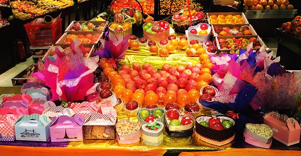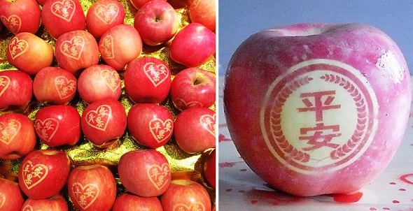 Er worden appels gekweekt waar zaken op staan als het karakter voor vrede, “Vrolijk kerstfeest”, de Chinese Nieuwjaarsspreuk “Vrede waar je ook mag gaan“, of een algemeen positief karakter zoals “liefde” of “voorspoed”. Supermarkten en fruitwinkels liggen de dagen voor kerst vol met deze appels, verpakt in kitscherige geschenkverpakkingen. Deze vinden gretig aftrek; Chinezen zijn immers niet vies van enige positieve symboliek.