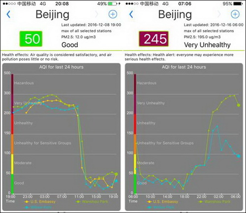 Wuhan ligt op een open vlakte, waardoor de fijnstofwaarden daar veel gelijkmatiger zijn dan in Beijing. Zie hieronder hoe de waarden in Beijing op twee willekeurige dagen in 24 uur extreem kunnen veranderen, terwijl ze in Wuhan vrijwel gelijk blijven: