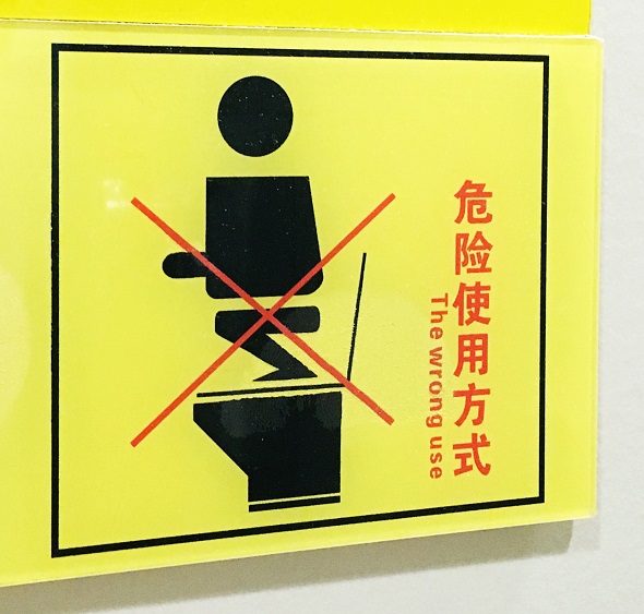 1) Dit soort aanmaningen kom je regelmatig tegen in Chinese openbare toiletten. Waarom? Omdat mensen die gewend zijn hun behoefte op een hurktoilet te doen, zittend niet genoeg kracht kunnen zetten. En als je hurkend op een westers toilet gaat zitten, geeft dat vieze voetafdrukken op de bril. Niet prettig voor de volgende gebruiker.
