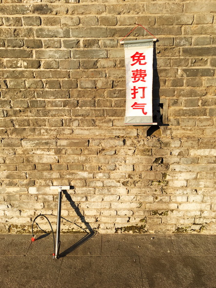 8) Iemand is zo aardig geweest om in Beijing, bij een punt waar je OV fietsen kunt halen, een fietspomp neer te zetten met daarbij een bordje waarop staat: ‘gratis banden oppompen’.