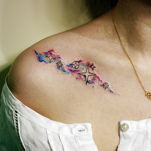 Wat een mooi werk! Vind het werk op het sleutelbeen heel tof, het lijkt bijna met waterverf gedaan.