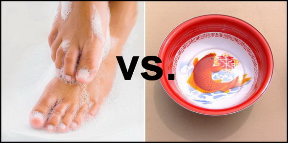 Omdat nog niet zo lang geleden de meeste Chinese huishoudens niet over eigen sanitaire voorzieningen beschikten, was douchen een luxe. Veel mensen gingen één keer per week naar het openbare badhuis voor een grondige douche. Om op de andere zes dagen ook schoon te blijven, wassen veel Chinezen dagelijks hun gezicht en voeten (en soms ook hun achterwerk) in een waskom.