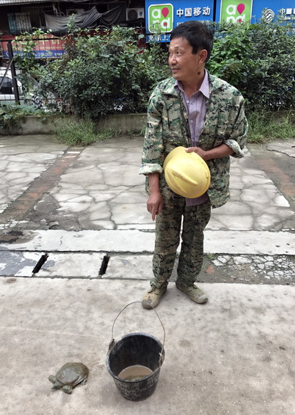 2) Een leuke manier om snel een extraatje te verdienen: je vangt een schildpad, en gaat buiten op een willekeurige plaats staan waar veel mensen langslopen, om de schildpad te verkopen. Niet als huisdier, maar voor in de soep. Dit heerschap prees onderstaande schildpad aan als ‘overheerlijk’ en verwachtte er 100-150 yuán voor te vangen. Niet onverdienstelijk dus.