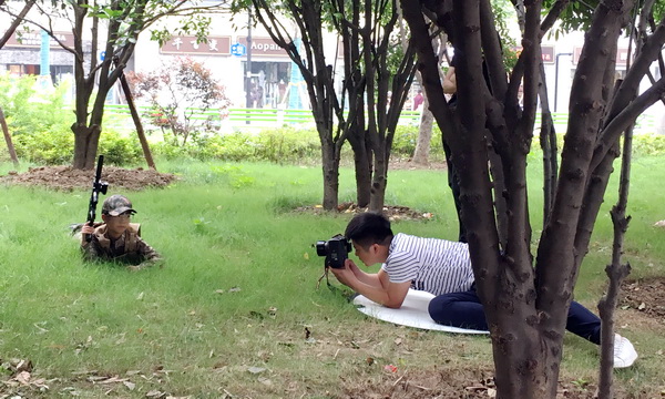 6) Fotoshoots zijn belangrijk in China. Niet alleen als je gaat trouwen, maar ook als een baby 100 dagen oud is. Of zomaar, voor de lol. Je kunt vaak een eigen stijl kiezen. Dit jongetje heeft duidelijk voor ‘leger’ gekozen, en de fotograaf had aan een perkje met een paar struiken genoeg om hem als sluipschutter in de jungle te doen overkomen op de foto’s. Altijd leuk voor boven de schoorsteen.