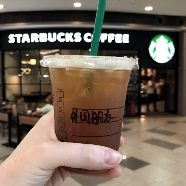 7) Eerder werd ik bij Starbucks niet met mijn naam aangesproken, zoals alle andere klanten, maar met de term lǎowài, buitenlander. Bij een andere vestiging werd ik vriendelijker benaderd: op onderstaande beker word ik wàiguó péngyou, ‘buitenlandse vriend’ genoemd.