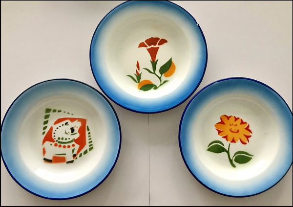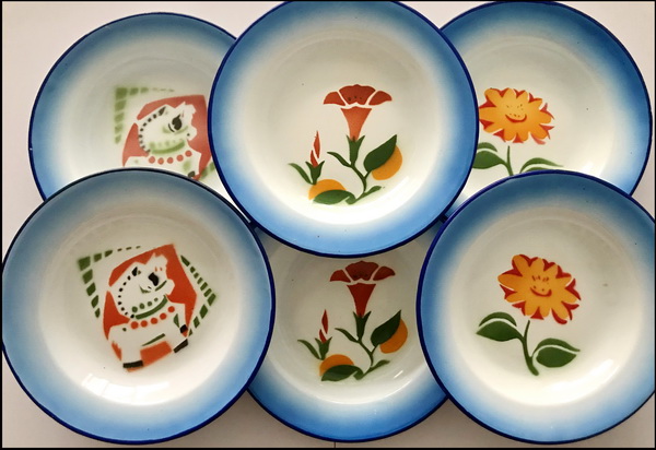 De tweede set komt, net zoals de eerste denk ik, uit de jaren ’80. In het China van voor de economische boom gebruikte bijna iedereen servies van emaille. Dat kan namelijk bijna niet stuk. Dit soort servies was vaak wit of mintgroen, met een donker randje. Toen het in de jaren ’80 steeds iets beter ging met China, kwamen dit soort bordjes met afbeeldingen erop in omloop. Daar is deze set een mooi voorbeeld van.