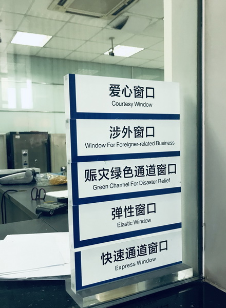 2) Er was iets met mijn Chinese bankrekening dat ik in persoon op moest lossen. Het eerste dat we daarom deden nadat we in China geland waren, was bij de bank langsgaan. Niet één van mijn favoriete soort bezoekjes, maar wat moet dat moet. Gelukkig kwam ik in aanmerking om geholpen te worden bij onderstaand loket. Gezien de hoeveelheid formulieren die ik in moest vullen, en de hoeveelheid bewijsstukken waarmee ik mijn identiteit diende te bewijzen (mijn laatste drie(!) paspoorten voldeden serieus niet), kwam de derde in het rijtje het meest in de buurt.