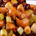 Dit Sichuanese gerecht is mild voor Sichuanse begrippen, niet zo pittig dan de gemiddelde buitenlander het niet meer aan kan. Krokante blokjes kip worden gebakken met pinda’s (soms cashewnoten) en blokjes groenten, meestal wortel en komkommer. Dat alles in een mild-pittige saus met karakteristieke sichuan pepertjes. Je kunt dit gerecht ook heel goed vegetarisch maken door de kip voor tofu te vervangen. Deze variant is ook in veel restaurants verkrijgbaar.