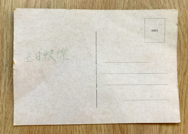 Opa was naar het Chin. Ind. Spec. Rest. gewandeld om zijn gebruikelijke bestelling te doen, en had de kaart meegenomen. Hij vroeg of ze er in het Chinees “Fijne verjaardag” op konden schrijven, en één van de koks was niet te beroerd om de inmiddels vaste klant te helpen.